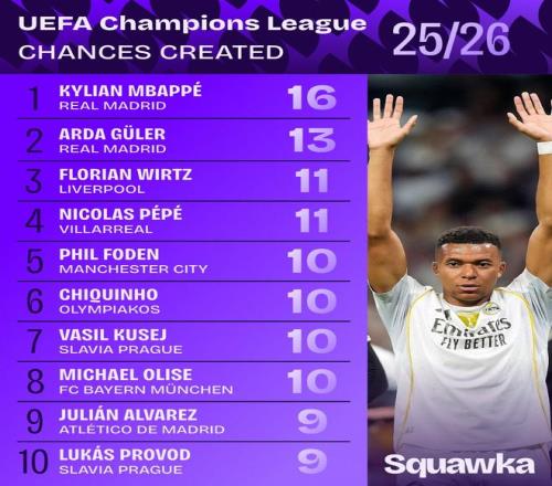 北京时间10月23日,在欧冠联赛阶段第3轮的比赛全部结束后,Squawka统计出了本赛季至今欧冠创造机会的排行榜,姆巴佩第一,居莱尔第二,维尔茨和尼古拉-佩佩并列第三。