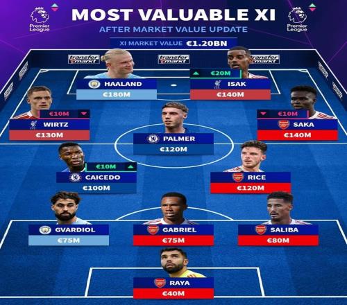 英超身价变更:维尔茨降至1.3亿欧,萨卡降至1.4亿欧,凯塞多升至1亿欧