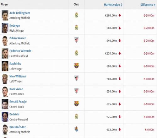 北京时间12月12日,德国转会市场更新了西甲球员身价,新一期的身价跌幅榜也随之产生。其中贝林厄姆、罗德里戈下跌2000万欧,巴尔韦德、拉菲尼亚下跌1000万欧。