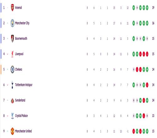 英超联赛第8轮的比赛结束,积分榜的格局再次发生了变化,随着曼城和阿森纳都迎来了一波连胜,利物浦却在双红会输给了曼联,已经从联赛榜首的位置掉到了第4,15个积分也落后排名第一的