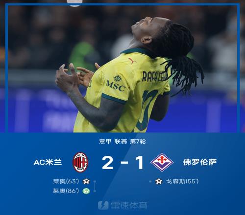 雷速体育10月20日宣 25/26赛季意甲联赛第7轮,AC米兰2-1战胜佛罗伦萨。上半场比赛两队互交白卷,下半场比赛戈森斯混战破门帮助佛罗伦萨首开纪录。随后莱奥远射破门扳平比分,比赛